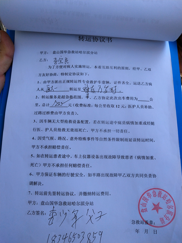 記者詢問了其中一名駕駛員車輛的相關(guān)手續(xù)和單位的資質(zhì),對方表示不清楚,他們只是司機,負(fù)責(zé)開車,一個月工資3000元錢,公司指派去哪接人送到哪,他們就按照指示去做。記者又問到:你們是怎么收費的?最遠(yuǎn)去到哪?車上有沒有醫(yī)護人員?對方說最遠(yuǎn)就是呼蘭,沒出過哈市,收費就是按照公里數(shù)收費。隨后工作人員在車?yán)镎业搅宿D(zhuǎn)運協(xié)議書,其中一張顯示車輛從醫(yī)大一院轉(zhuǎn)運至肇東市,收取費用是1200元(收費標(biāo)準(zhǔn):每公里收取12元,醫(yī)護人員補助、過路過橋費由甲方負(fù)責(zé))。針對此情況,由于不確定車輛是否具備營運資質(zhì),需要和遼寧還有患者家屬方面核實,所以將車輛的相關(guān)證件暫扣。