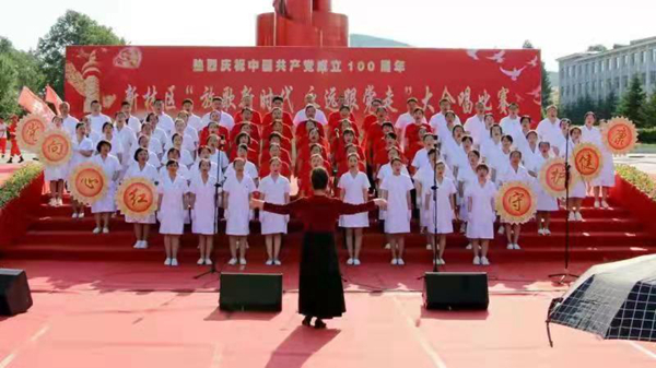 新林林業(yè)局機(jī)關(guān)黨委為現(xiàn)場(chǎng)觀眾展演《沒(méi)有共產(chǎn)黨就沒(méi)有新中國(guó)》《歌唱祖國(guó)》。大合唱現(xiàn)場(chǎng)舉行了黨旗傳遞活動(dòng),巨幅黨旗經(jīng)過(guò)新林區(qū)局黨員干部職工緩緩傳遞。