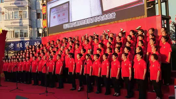 在歌聲中重溫百年歷程,追尋紅色記憶;在歌聲中砥礪無悔初心,汲取奮進(jìn)力量。塔河縣廣大職工群眾在縣新時代文明實(shí)踐廣場以大合唱的方式縱情高歌,用滿腔的熱忱唱出了對黨的熱愛,對偉大祖國的贊美。由塔河縣森林之聲合唱團(tuán)表演的曲目《祖國頌》《我愛你中國》拉開了演出的序幕,瞬間就調(diào)動了人們的情緒,激發(fā)了人們的愛國豪情。《不忘初心》《走向復(fù)興》《強(qiáng)軍戰(zhàn)歌》《忠誠于黨》等一首首經(jīng)典曲目表達(dá)了塔河兒女對黨的忠誠與熱愛,展現(xiàn)了塔河人奮發(fā)有為、積極向上的良好精神風(fēng)貌。