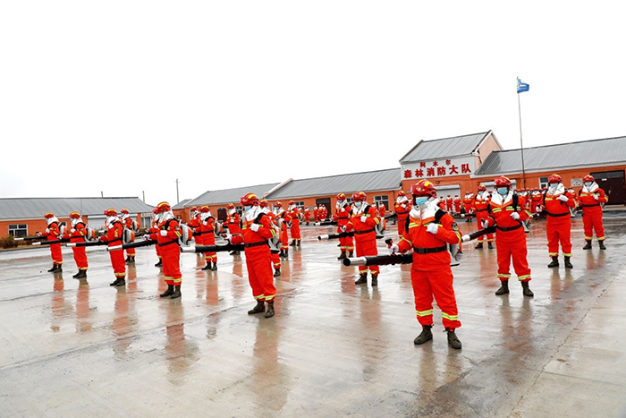 阿木爾林業(yè)局專(zhuān)業(yè)撲火隊(duì)員正在進(jìn)行風(fēng)力滅火機(jī)科目演練(王力 攝)