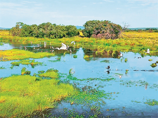 目前,保護區(qū)濕地草木蔥郁豐茂,河水波光粼粼,白鷺、蒼鷺、東方白鸛等珍禽在空中翱翔,呈現(xiàn)出生態(tài)和諧的勃勃生機。