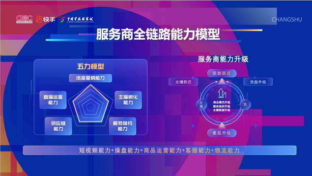 快手電商服務(wù)商則介紹了服務(wù)商全鏈路能力模型。針對(duì)商家主播能力弱、私域流量差、貨品不健全、投流ROI難提升等痛點(diǎn),服務(wù)商可以發(fā)揮流量營(yíng)銷、直播運(yùn)營(yíng)、主播孵化、供應(yīng)鏈、服務(wù)履約等全鏈路能力,助力商家冷啟孵化和躍遷。自今年3月底常熟服飾產(chǎn)業(yè)帶落地至今,快手服務(wù)商已服務(wù)500多個(gè)常熟商家,常熟當(dāng)?shù)乜焓謩?dòng)銷商家數(shù)提升30%+。