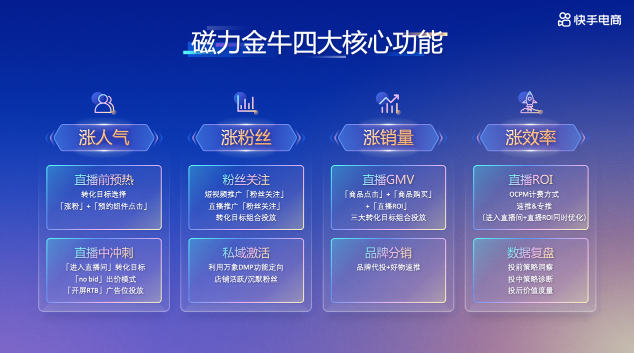 本次活動(dòng),快手磁力金牛和快手電商服務(wù)商也宣布推出一系列政策,推動(dòng)常熟女裝商家電商生意增長(zhǎng)。作為電商生意的加速器,快手磁力金牛讓商家投流更精準(zhǔn)、效率更高、效果更好。在賬號(hào)啟動(dòng)期,商家可借助磁力金牛進(jìn)行私域起量,并根據(jù)貨盤制定營(yíng)銷策略;在賬號(hào)成長(zhǎng)期,商家可依據(jù)S-A-B直播策略模型,使用磁力金牛進(jìn)行差異化投流、精細(xì)化運(yùn)營(yíng);在賬號(hào)成熟期,磁力金??梢栽谄沸f(xié)同下進(jìn)行差異化拓客,引入新流量。