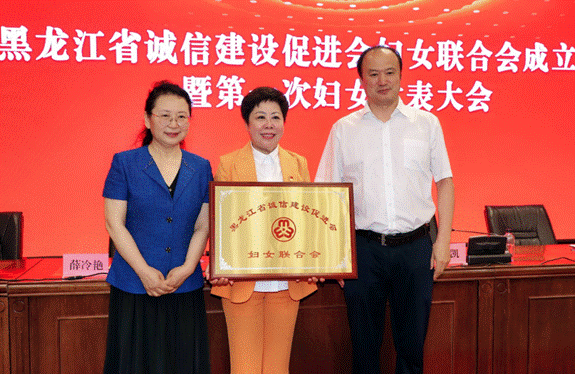 省直機關(guān)工委副書記、全省性社會組織黨委書記徐凱,省婦女聯(lián)合會黨組成員、省政府婦兒工委辦主任姜秀麗為黑龍江省誠信建設促進會婦女聯(lián)合會頒發(fā)牌匾。