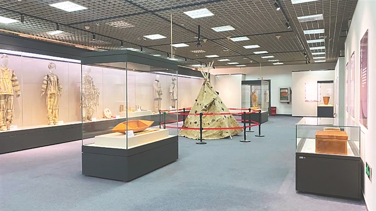 “三皮文化”是北方少數(shù)民族在長期生活生產(chǎn)實(shí)踐活動中,使用魚皮、獸皮、樺樹皮創(chuàng)造出的物質(zhì)財(cái)富和精神財(cái)富的積淀。這是展覽現(xiàn)場。圖片由省博物館提供
