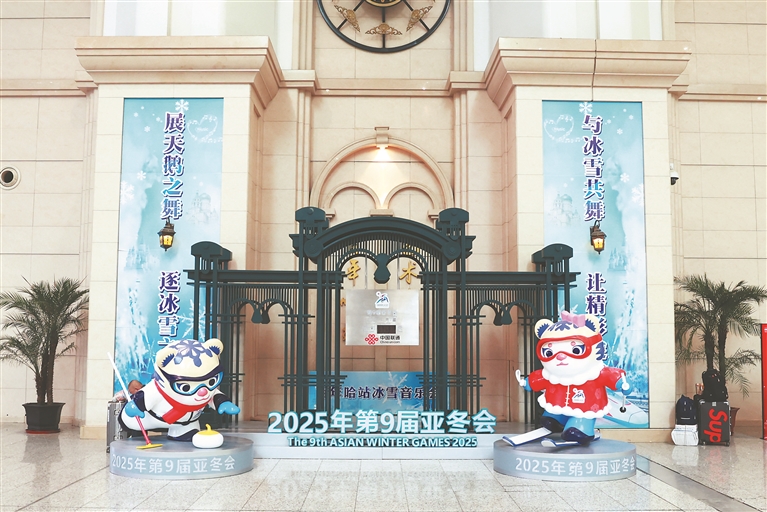 哈爾濱火車站候車廳內(nèi)的亞冬會雕塑展示。楊闖攝