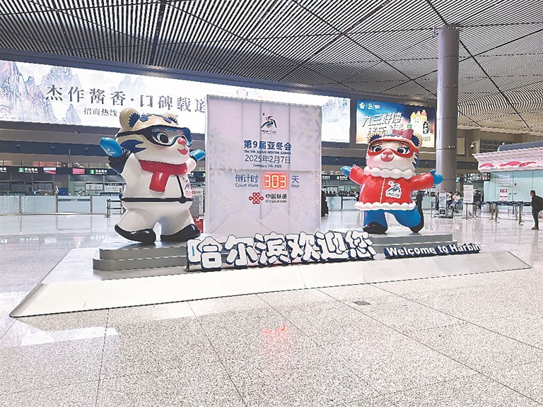 可愛的亞冬會吉祥物“濱濱”“妮妮”擺出熱烈歡迎的姿勢,為到達(dá)哈爾濱的旅客們提供一個(gè)充滿活力和歡迎感的第一印象。