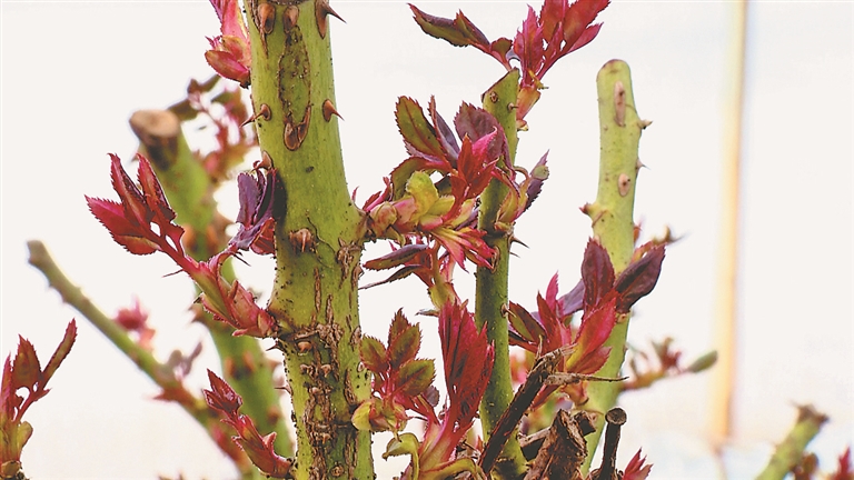 4月,鐵力市花香驪城園林綠化有限公司的玫瑰花種植大棚內(nèi),春色滿棚,花香清幽,花匠們正在給成功越冬的地栽玫瑰通風、松土、施肥,一排排玫瑰枝條上已經(jīng)長出花蕾,整齊地矗立在床土中靜待花開。