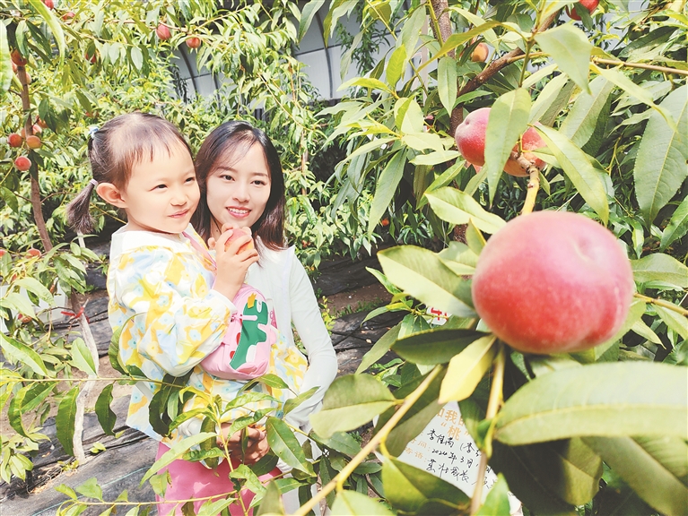 “我認(rèn)養(yǎng)了一棵桃樹,今天和妻子共同看看桃子的長勢(shì),過些天就可以親自采摘了?!标P(guān)勇和妻子正在查看認(rèn)養(yǎng)的桃樹。