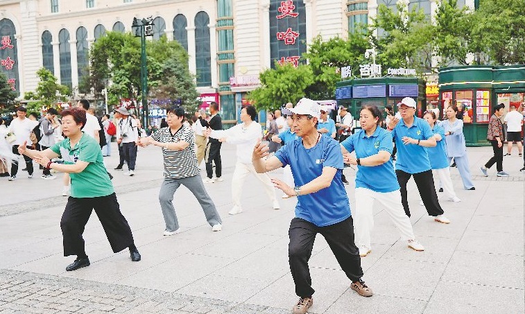 在哈爾濱建筑藝術(shù)廣場上,可以看到來自各地的游人正在打卡拍照,來自青島的老年旅游團(tuán)還在此打起了太極拳。據(jù)同程旅行發(fā)布的《2024暑運出行趨勢報告》,自6月份以來,哈爾濱成為這個暑期熱門避暑目的地,6月中旬開始,黑龍江的人氣快速上升。本報記者 張澍攝