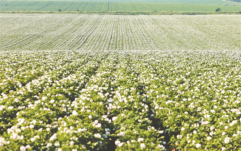 目前,各品種馬鈴薯相繼進入盛花期,連片怒放的馬鈴薯花給大地鋪上了美麗的地毯,也奏響了致富增收的新樂章。
