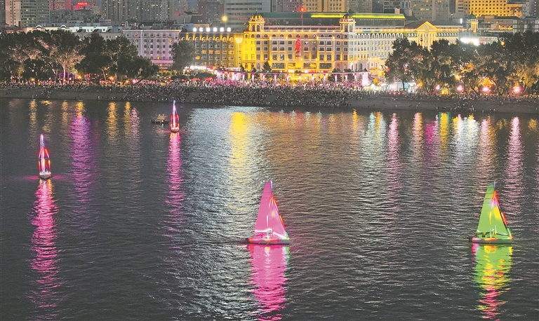 近日,松花江哈爾濱市道里區(qū)防洪勝利紀(jì)念塔江段,每晚都會(huì)有多艘靚麗的彩色帆船巡游表演。十幾艘白色帆船船身上變幻的4D彩飾燈,仿佛披著斑斕的霓裳,光影暈染在波光粼粼的江面,形成一道道淺淺的虹,讓夏夜的松花江愈顯美麗動(dòng)人。這是哈爾濱市總工會(huì)組織的職工帆船表演隊(duì),每艘帆船上安裝有百米長燈帶、小型發(fā)電機(jī)和微電腦,形成4D燈光秀效果,每天9時(shí)30分至11時(shí)、19時(shí)30分至21時(shí)表演。