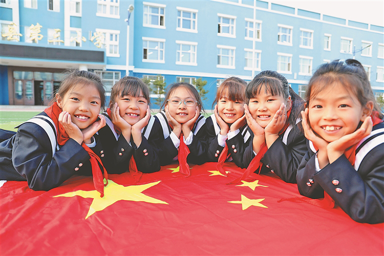 呼瑪縣第二、第三小學(xué)的孩子們和國旗合影。本報(bào)記者 郭俊峰攝
