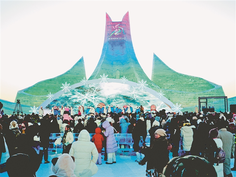 精美與靈動相互交織,園區(qū)內(nèi)亞冬會氛圍濃厚?!拔覀冊趫@區(qū)內(nèi)看到很多亞冬會元素的冰雪景觀,像雪雕‘濱濱’‘妮妮’、會徽大地景觀等,準備逐個打卡?!鄙綎|游客許多開心地說。