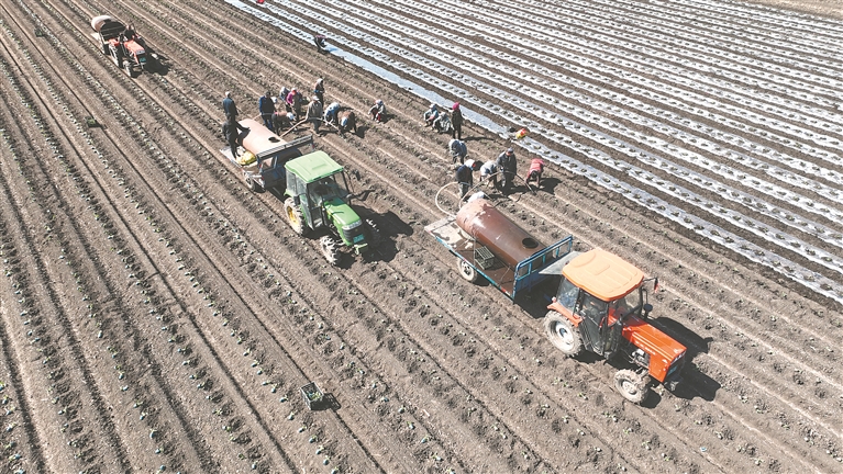 通往新華鄉(xiāng)的道路兩側(cè),儼然一幅動(dòng)態(tài)的農(nóng)事畫(huà)卷:拖拉機(jī)“突突”作響,拉著水罐在田壟間穿梭;菜農(nóng)們分工默契,有人鋪設(shè)地膜,白色薄膜在黑土地上延展成浪;有人彎腰移栽,鮮嫩菜苗被小心植入土中;有人手持水管緊隨其后,清水汩汩滋潤(rùn)著新苗。覆膜、栽苗、澆水,動(dòng)作連貫流暢,田埂間回蕩著農(nóng)具與泥土的碰撞聲,交織成初夏最生動(dòng)的勞作交響。